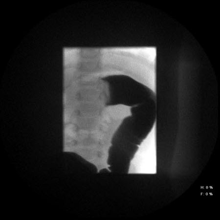 肠套叠:腹部 X 线平片可显示钡剂在肠套叠梗阻部位通过受阻