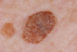 脂溢性角化病是一种常见的多发良性皮肤肿瘤,最常见于躯干,多发于四五十岁时。 50 岁以上的人中有 80% 到 100% 会受影响。 临床病变是界限清楚的灰色,棕色或黑色斑,类似于“粘附“皮肤上。 后来斑块会凸起,可能会出现疣状表面。 大多数病变直径不超过 1 cm。 病变通常无痛,不需要治疗。[1]Pierson D, Bandel C, Ehrig T, et al. Benign epidermal tumors and proliferations. In: Bolognia JL, Jorizzo JL, Rapini RP, eds. Dermatology. London: Mosby; 2003:597-602.[2]MacKie RM, Quinn AG. Non-melanoma skin cancer and other epidermal skin tumors. In: Burns T, Breathnach SM, Cox N, et al, eds. Rook's textbook of dermatology. 7th ed. Oxford, UK: Blackwell; 2004:36-45.[3]Weedon D. Chapter 31: Tumors of the epidermis. In: Weedon D. Skin pathology. 2nd ed. London: Churchill Livingstone; 2002:765-771.[4]Altmeyer P, Bacharach-Buhles M, eds. Enzyklopadie dermatologie, allergologie, umweltmedizin. Berlin: Springer; 2002.[5]Yeatman JM, Kilkenny M, Marks R. The prevalence of seborrhoeic keratoses in an Australian population: does exposure to sunlight play a part in their frequency? Br J Dermatol. 1997;137:411-414.http://www.ncbi.nlm.nih.gov/pubmed/9349339?tool=bestpractice.com